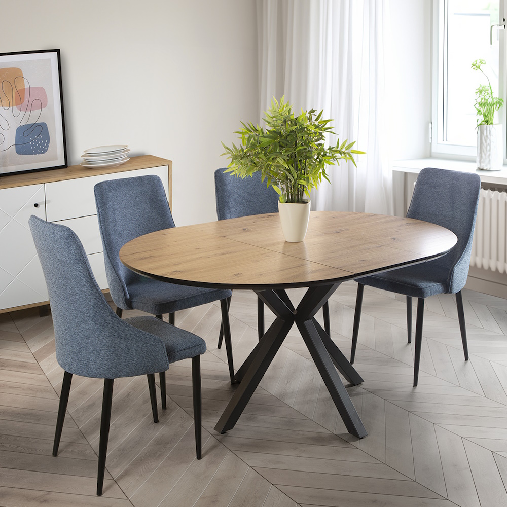 Mesa de comedor redonda fabricada en MDF con acabado en roble artisan texturizado en sobre y negro en borde, con extensible externo en el mismo acabado y patas metálicas en aspa disponible en negro y blanco. Se sirve desmontada en dos bultos.