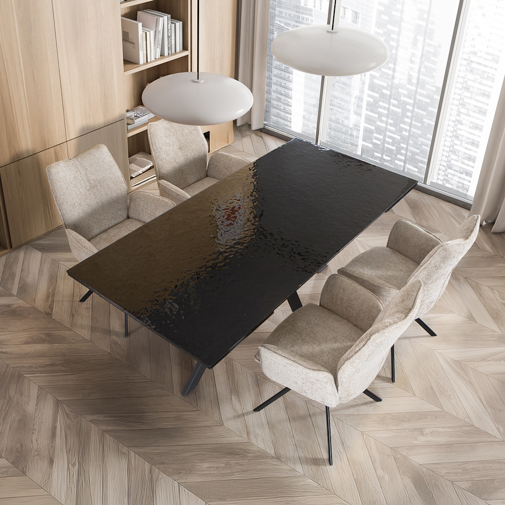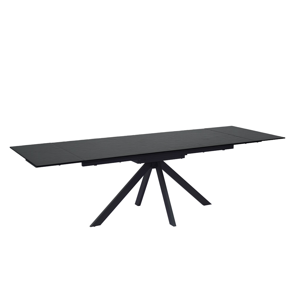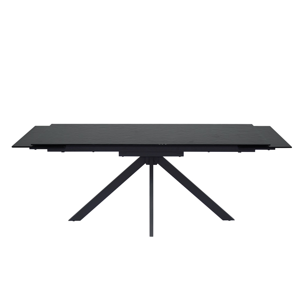 Mesa extensible con tapa de cristal texturizado alto brillo en color negro. Patas metálicas en acabado color negro. Sistema de apertura de dos extensibles laterales independientes.
