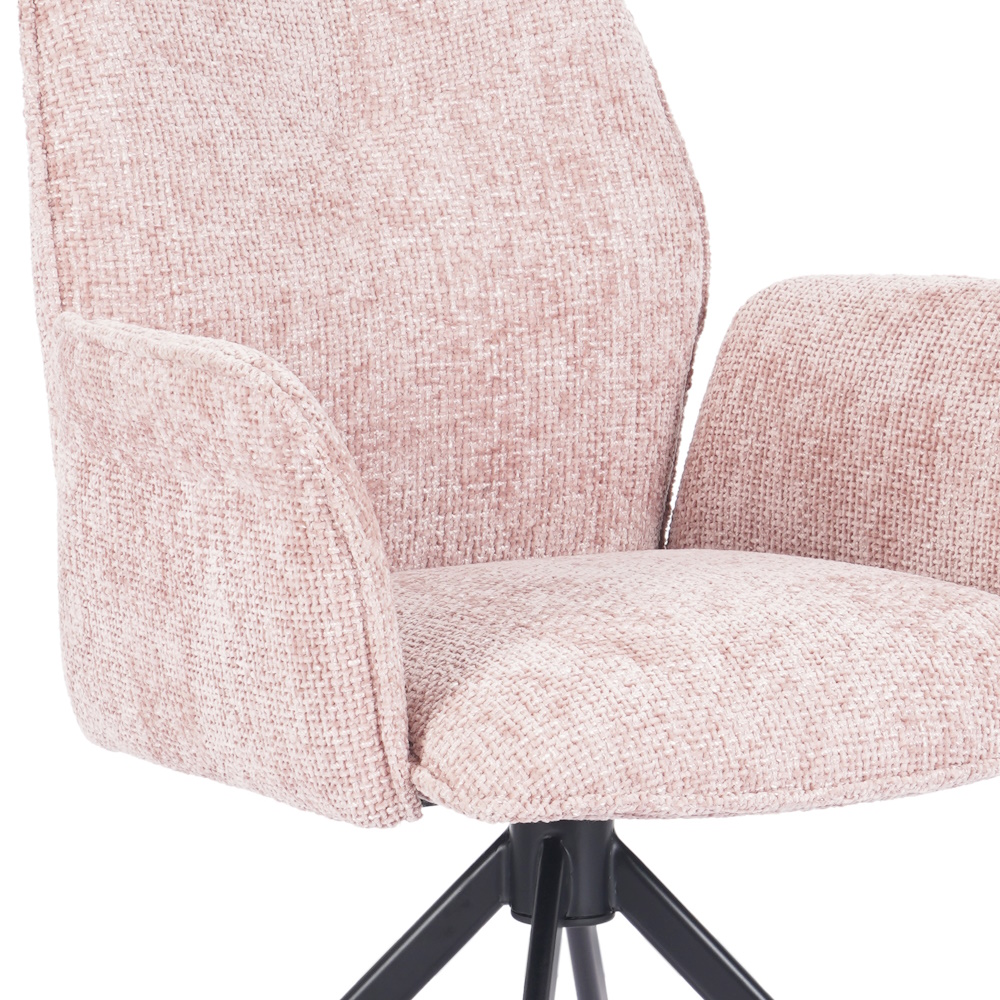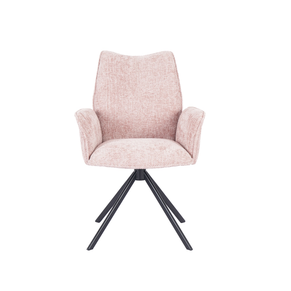 Silla con brazos tapizada en tela con patas metálicas de color negro. Asiento y respaldo ergonómicos y acolchados. Mecanismo giratorio 180º con retorno automático. Disponible en colores beige, rosa, gris y verde musgo. Se sirve en cajas de 2 unidades.