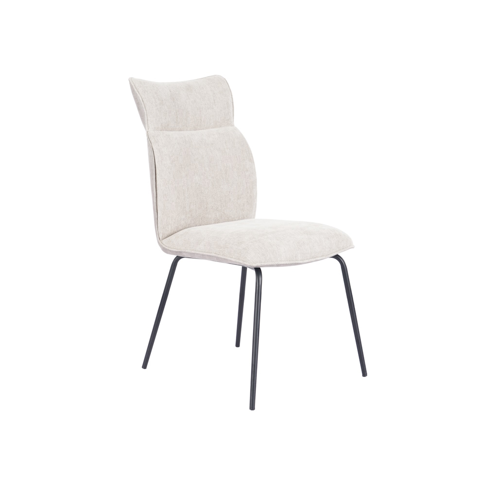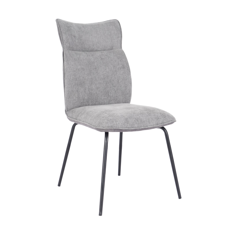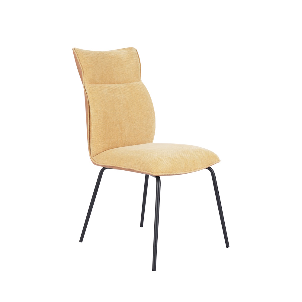 Silla con tapizado de distintos materiales y patas en acabado color negro. Asiento y respaldo ergonómicos y acolchados tapizados en tela tipo chenilla y trasera tapizada en símil napa. Disponible en colores beige, teja, mostaza y gris oscuro. Se sirve en cajas de 2 unidades.