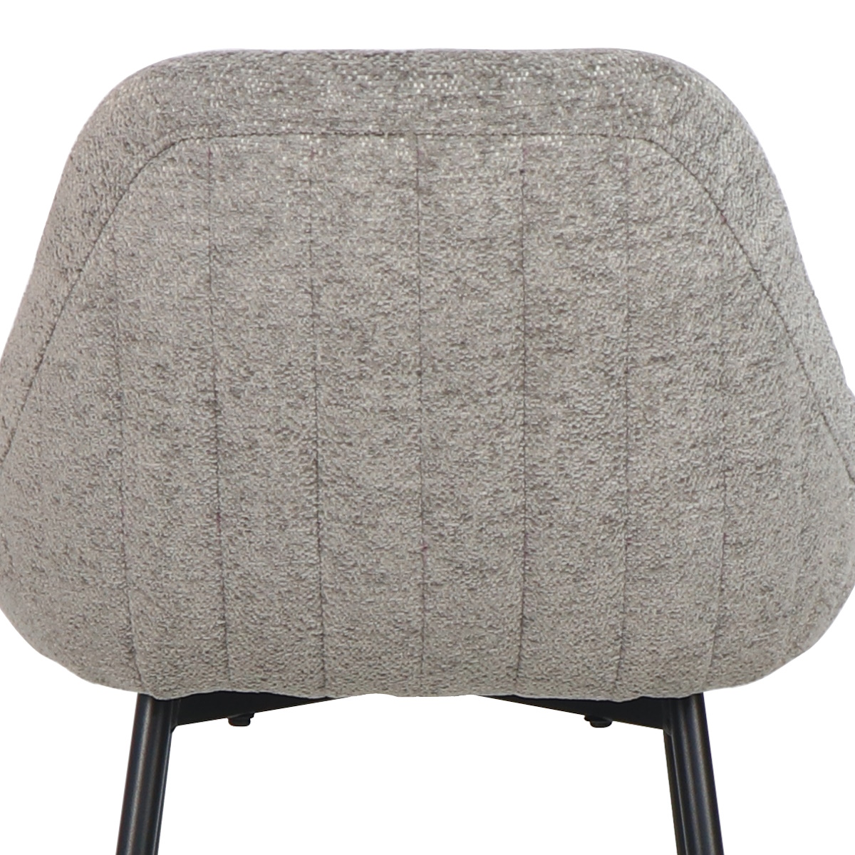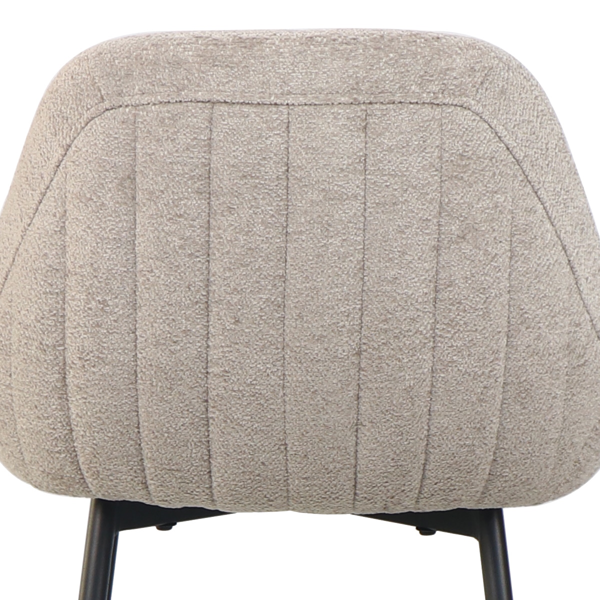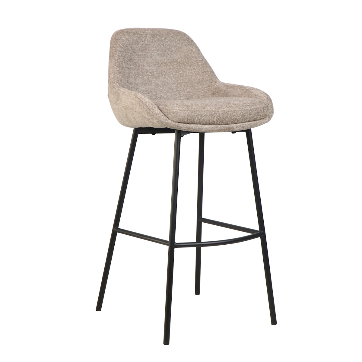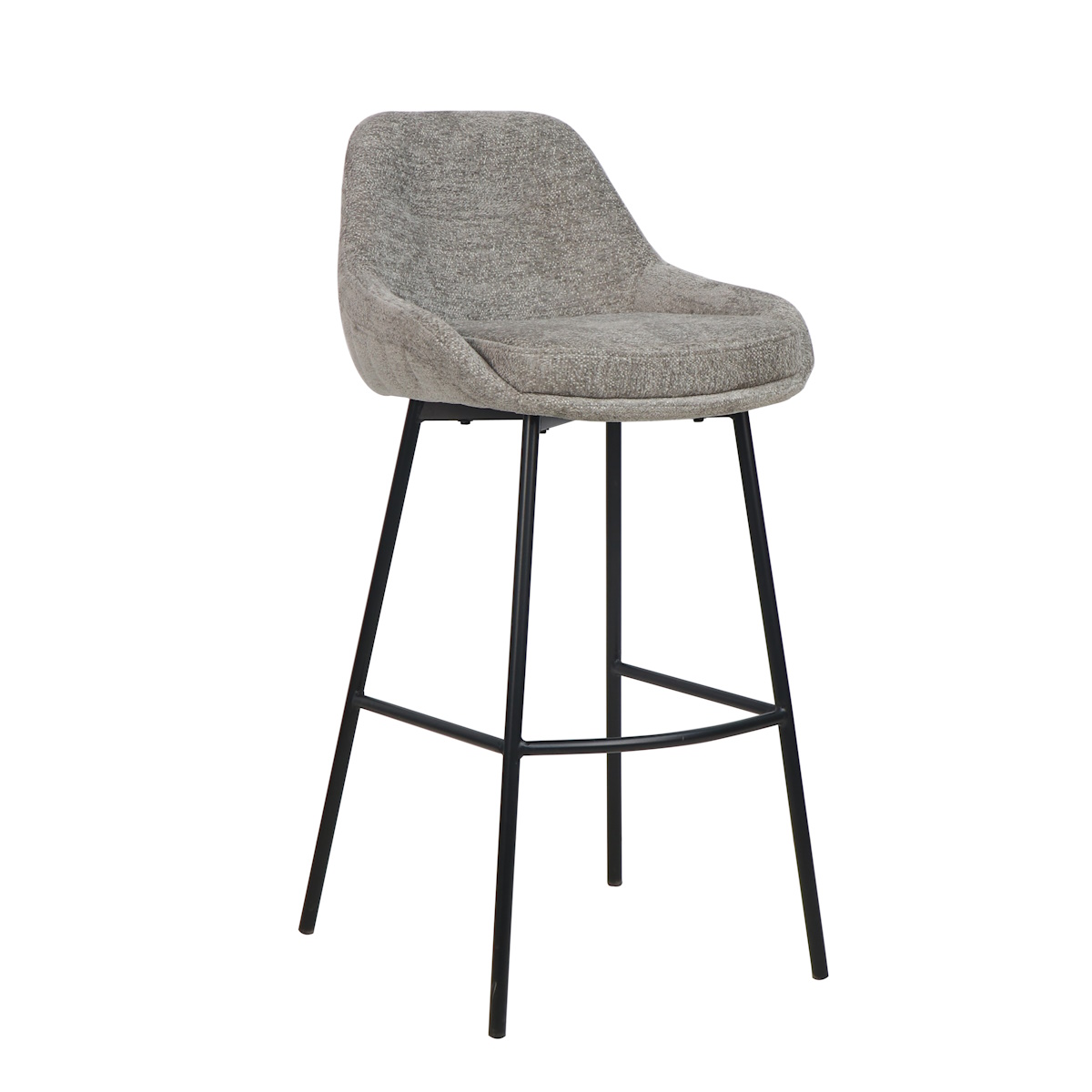 Taburete alto con asiento y respaldo de madera tapizados en tela Raven con patas metálicas en color negro. Disponible en color beige tostado y gris. Se sirve en cajas de 2 uds.